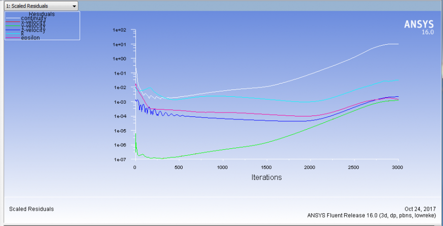 各位大神,我计算的是圆管内的流场问题,计算域是一个圆管, 雷诺数去的是7000, 使用RNG 模型可以收敛,但是利用fluent中LB的低雷诺数ke模型就不能收敛,残差如下:前500步有收敛的趋势, 后面突然就开始发散了。这个例子yplus=1。求指导一下是什么原因,怎么修改。 RW$[JCWJ7_J26XM(7ZNP_%G.png |