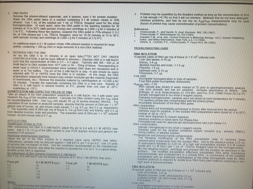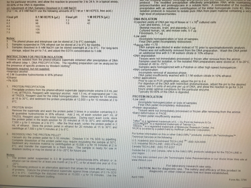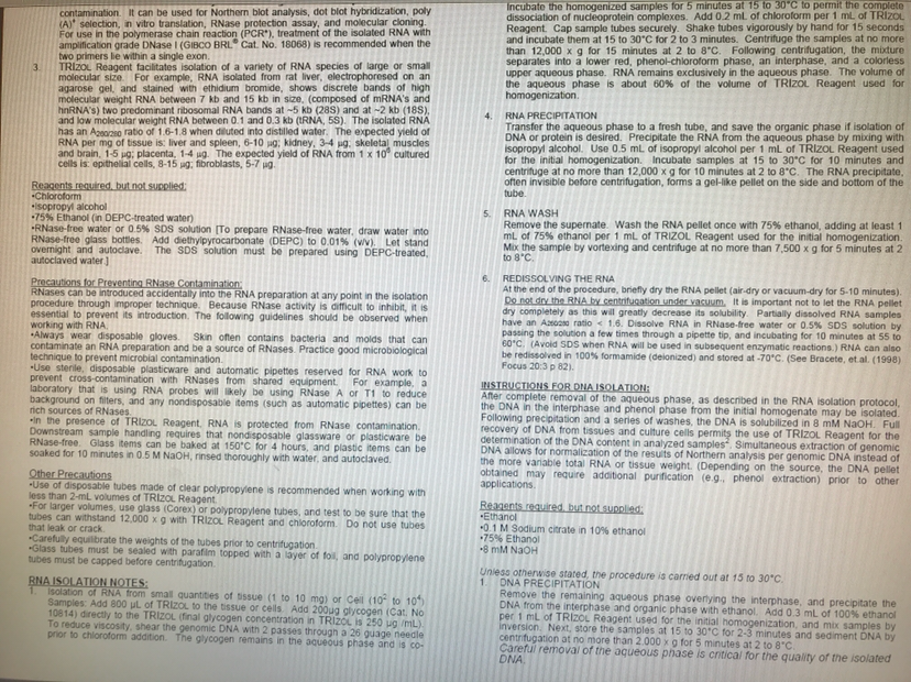 最近需要用TRIzol试剂来提取e.coli的RNA和DNA,经过几次尝试,RNA提出来的浓度和纯度都不错,但是DNA却差的离谱……最近几次的数据OD260/OD280竟然都不到1……UV的图谱也十分诡异,不像是DNA,我们是严格按照Protocol来走的,也尝试过改进一些步骤,但是都没有明显效果,求大神指点有没有办法提高DNA的纯度~ 附全套protocol, 使用的试剂与protocol为配套同一公司的~ 发自小木虫IOS客户端 |