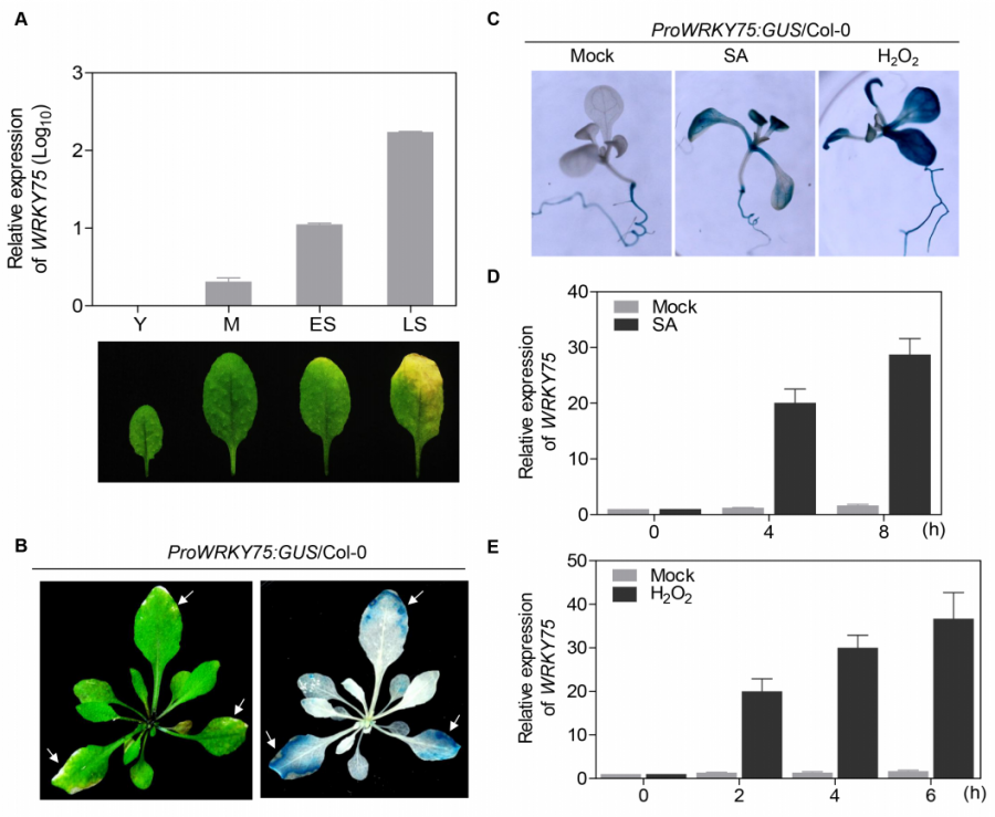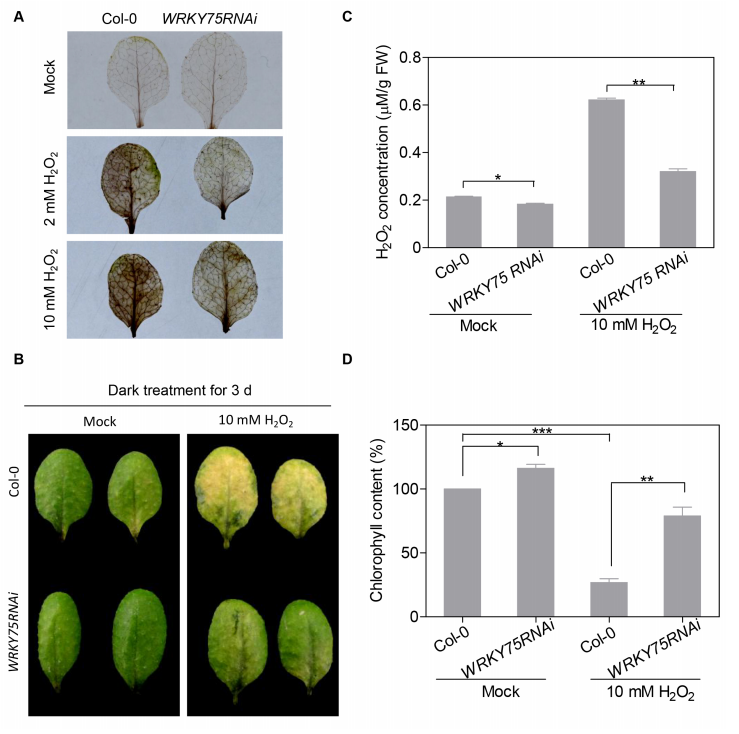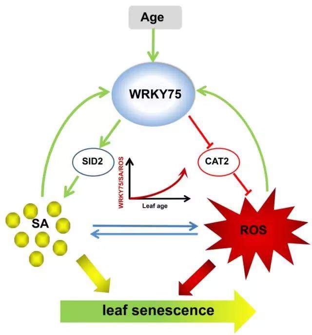 南科大-北大植物与食品联合研究所在植物学顶级期刊《The Plant Cell》在线发表了研究论文。该研究揭示了模式植物拟南芥WRKY家族转录因子WRKY75与植物激素水杨酸 (SA)以及活性氧(ROS)形成正向促进调控环,协同调控叶片衰老的分子机制。该研究提出了植物叶片衰老进程的晚期具有不可逆性以及分子机制,加深了对植物叶片衰老的理解,为通过分子育种延缓植物叶片衰老进而提高粮食产量提供了理论依据。 叶片是植物光合作用的主要器官,叶片早衰影响作物的产量和品质,给农业生产带来了很大的损失。衰老是叶片发育的最后阶段,是一个受到严格遗传调控的程序化的细胞死亡的过程。影响叶片衰老的因素诸多,包括叶龄、植物激素、活性氧含量等内因以及干旱、极限温度、生物胁迫和非生物胁迫等外因,因此叶片衰老的过程并不是受某个单一因素调控,而是存在一个非常复杂的调控网络。该研究通过叶片衰老表型分析筛选到一个叶片延缓衰老的植株WRKY75RNAi,研究发现,WRKY75RNAi植株表现出明显的叶片延缓衰老的表型,以及通过CRISPR-Cas9 的方法定向敲除WRKY75基因获得的wrky75-KO的植株也表现出叶片晚衰的表型,而组成型过表达WRKY75则引起叶片过早衰老。 进一步研究表明,WRKY75基因表达受到叶片年龄、水杨酸和活性氧的诱导,同时通过全基因组转录组分析、基因表达分析以及基因与蛋白互作分析发现WRKY75直接促进水杨酸合成关键基因SID2的转录,并且抑制过氧化氢(H2O2)的清除基因CAT2的表达,最终导致水杨酸和过氧化氢的积累。而已知水杨酸和过氧化氢可以互相促进,因此WRKY75、水杨酸和过氧化氢三者形成两两互相促进的调控环。 在叶片发育的早期,三者的含量均保持在较低的水平,而随着叶片年龄逐渐增加,由于正循环的存在使得三者的含量递增,直至达到某一个阈值后出现不可逆转的增长,进而推动叶片衰老不可逆转地向前推进。该正循环调控网络在分子水平上揭示了WRKY75调控叶片衰老的分子机制,解释了植物衰老晚期具有不可逆性的原因。 |