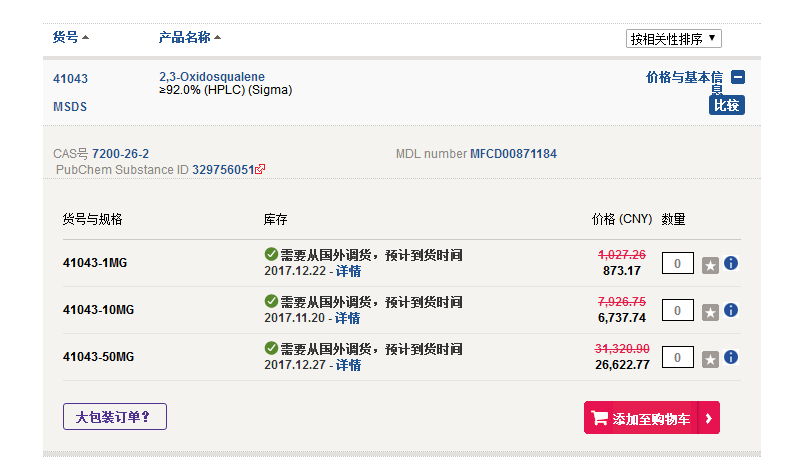 本人目前正在做氧化酶的体外酶活,九月份于Sigma官网购买产物标准品 2,3-Oxidosqualene (Sigma),但是经sigma负责人查询从国外进货最快12月份才能到中国,现在实验继续该标准品,发此贴希望手头有该样品的同僚们能帮忙一下,只需要能够GC-MS检测的量即可,有一定报酬,感谢!第一次写帖,可能语言组织不太好,希望大家见谅!![]() sigma官网截图.png |
