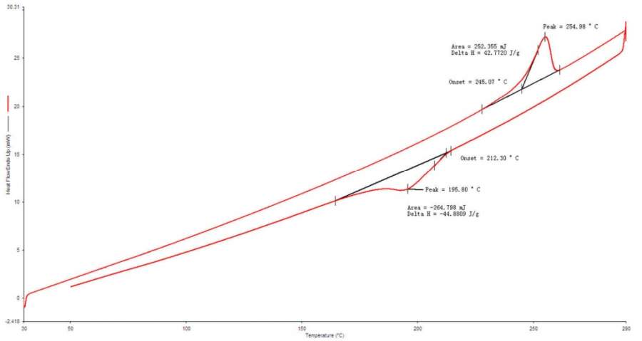 想测试PET薄膜的当前状态结晶度,DSC程序:初始温度30℃,升温速率10℃/min,升温至290℃,恒温20min,以降温速率10℃/min,降温至50℃。 不知测试方法是否有误? 以下是测试曲线,请问怎么计算?是热结晶焓直接除以PET的100%结晶焓吗?还是热结晶焓减去冷结晶焓。也没找到测试PET薄膜结晶度的相关文献。 求高手解答 11.jpg |