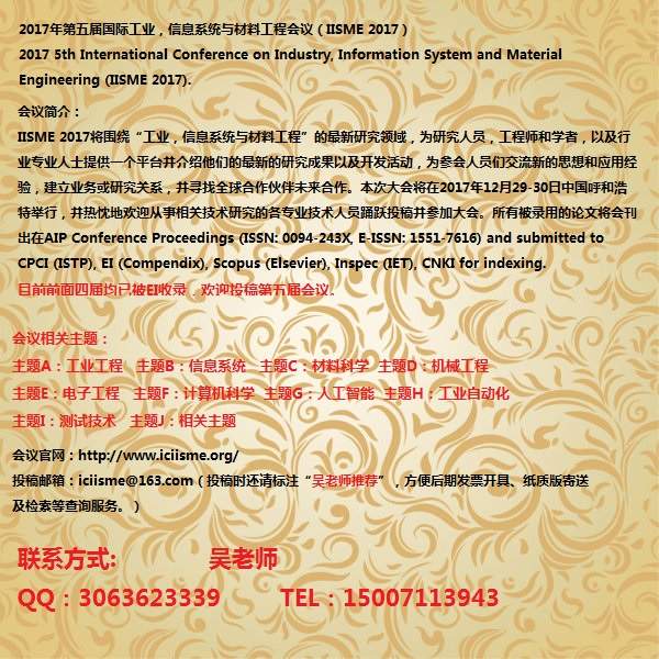 有人参加国际工业,信息系统与材料工程的会议么?已有1人参与