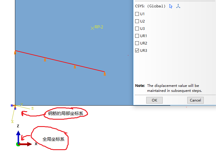 用abaqus模拟一根beam单元钢筋(图中红色)置于基体(图中蓝色)中。 钢筋的局部坐标系与全局坐标系不重合。 现在限制钢筋关于全局坐标系z轴的转动,即全局UR3=0。 请问:全局UR3=0的限制是如何作用到钢筋上的,是否与在局部坐标系中限制钢筋的局部UR3=0是一样的效果? Image 16.png |