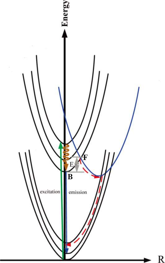 Arrhenius equation是由瑞典的阿伦尼乌斯所创立的化学反应速率常数随温度变化关系的经验公式,写作 k=Aexp(-Ea/RT)。k为速率常数,R为摩尔气体常量,T为热力学温度,Ea为表观活化能,A为指前因子(也称频率因子)。 Arrhenius equation的两个假设:1. 只有能量高于一定数值的粒子才能发生反应;2. 能量高于此值的粒子有一定概率发生反应。前者用表观活化能Ea来表示,后者由指前因子A来表示。 后来该公式推广开来,具体到荧光粉的热焠灭,根据发光热焠灭机理(如图),从B到F的跃迁几率正比于cexp(-E/RT),从而推导出楼主提到的发光强度与温度的关系。 至于c代表什么意义,可以类比下: 跃迁几率------化学反应速率 热活化能-----表观活化能 c------A,对比上面A的含义,可以粗略的说,c反映了BF所在抛物线所对应的、能量高于E的粒子发生无辐射跃迁的概率(并非所有高于E的粒子都会发生无辐射跃迁)。 至于c与什么因素有关,不好说,估计也没有什么权威的答案,毕竟只是一个经验公式。 一家之言,仅供参考。 |
