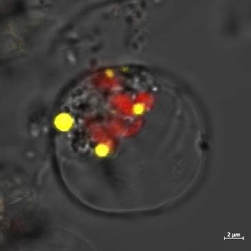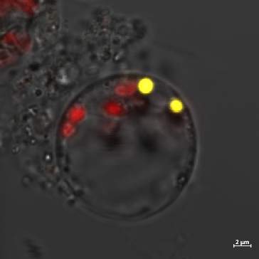 做了两次水稻亚细胞定位,用的是原生质体进行转化。目的基因偶联YFP,红色是叶绿体自发荧光。求助各位大神知不知道这是什么细胞器啊?大概一个细胞里有1-5个不等的信号![]() merge-1.jpg merge-2.jpg |