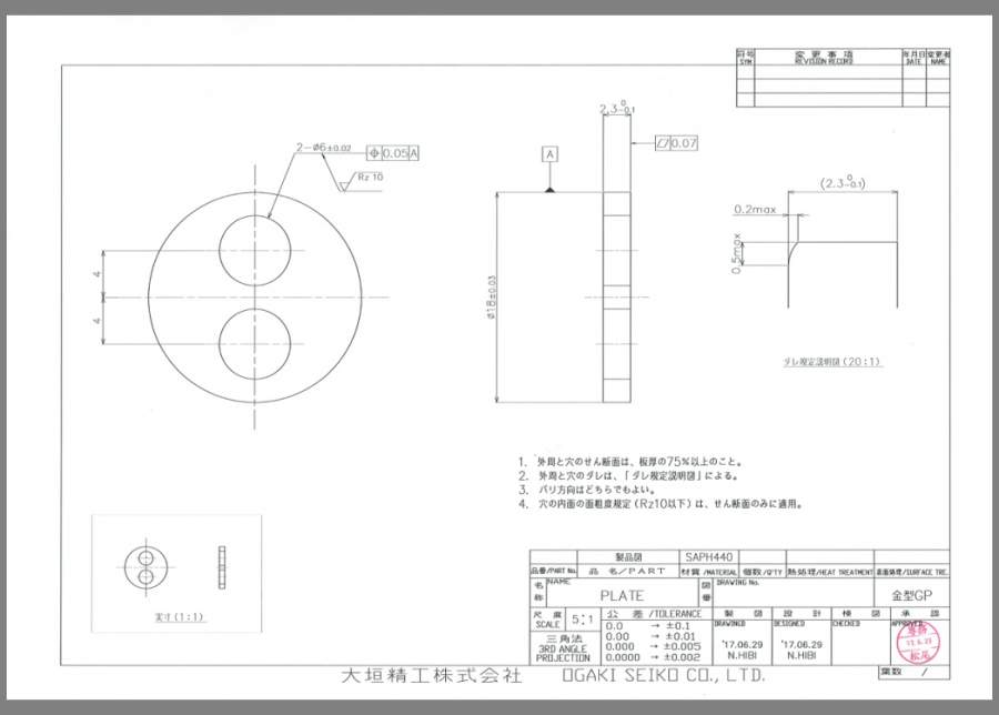 各位兄弟姐妹,大家好: 我是经朋友介绍刚刚来小木虫的新人,有个精密冲压件的模具设计问题想请教,希望各位前辈给解答一下。谢谢! 这个零件的模具设计,主要是两个孔之间的距离是2,板材厚度是2.3,进行冲压时不能保证断面质量,而该零件对断面要求较高(包括零件的外圆周),希望有前辈给点建议。谢谢! IMG_7269(20171106-162717).jpg |
