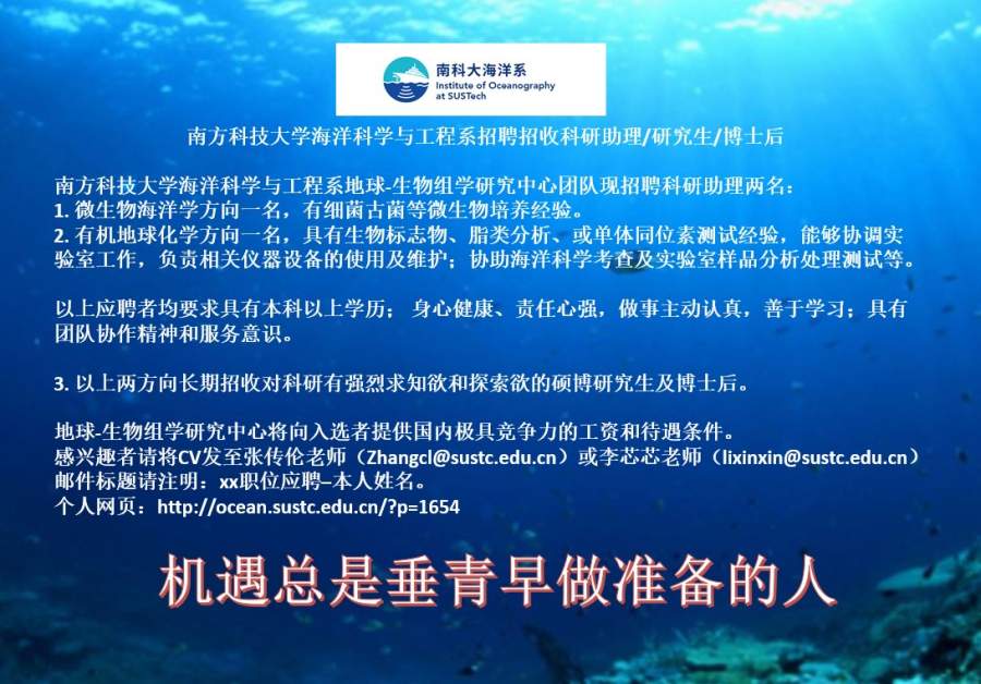 南方科技大学海洋科学与工程系地球-生物组学研究中心团队现招聘科研助理两名: 1. 微生物海洋学方向一名,有细菌古菌等微生物培养经验。 2. 有机地球化学方向一名,具有生物标志物、脂类分析、或单体同位素测试经验,能够协调实验室工作,负责相关仪器设备的使用及维护;协助海洋科学考查及实验室样品分析处理测试等。 以上应聘者均要求具有本科以上学历; 身心健康、责任心强,做事主动认真,善于学习;具有团队协作精神和服务意识。 3. 以上两方向长期招收对科研有强烈求知欲和探索欲的硕博研究生及博士后。 地球-生物组学研究中心将向入选者提供国内极具竞争力的工资和待遇条件。 感兴趣者请将CV发至张传伦老师(Zhangcl@sustc.edu.cn)或李芯芯老师(lixinxin@sustc.edu.cn) 邮件标题请注明:xx职位应聘–本人姓名。 个人网页:https://ocean.sustc.edu.cn/?p=1654 招聘.jpg [ 来自版块群 广东 ] |