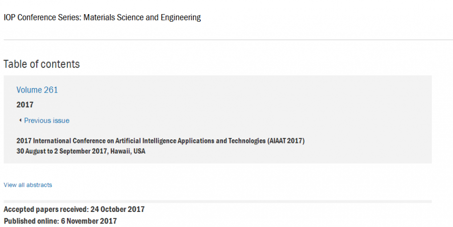 小伙伴们,人工智能应用和技术国际会议AIAAT2017会议论文集已经出版啦 AIAAT2018将于2018年8月8日至10日在中国上海举行 官方网站:https://aiaat.org/ 小伙伴还在等什么呢 快来投稿吧! 等你哦~ |