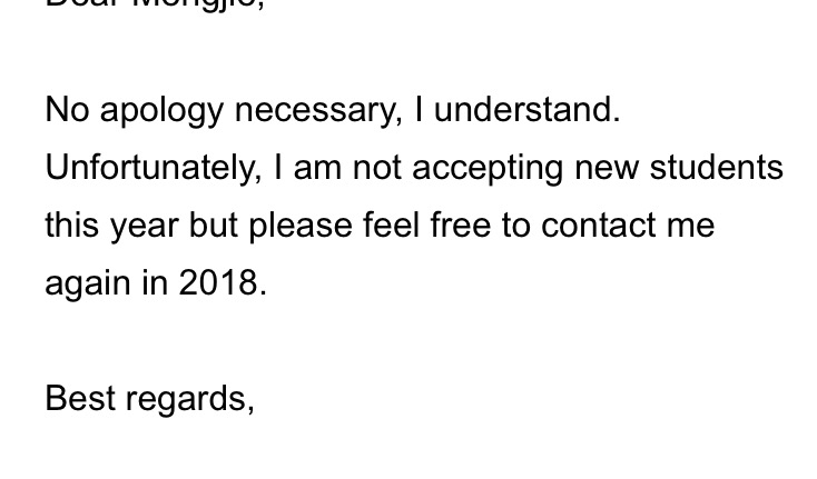 发邮件不慎把导师名字写错了,发了道歉信,然后导师这样回复的……还有一个问题,就是我在套瓷信里已经说明了自己2018年毕业想去读博士啊……导师让我2018年再联系他?是说现在不能定么……还是什么婉拒的理由啊……求助……还要不要继续套下去…… 发自小木虫IOS客户端 |