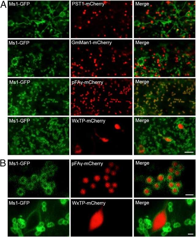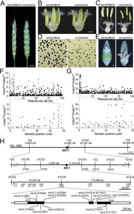 小麦是全球范围内种植的主要粮食作物,是全球大约30%人口的主要食物来源。全球人口的持续增长、人们生活水平的不断提高和生活质量的持续改善要求小麦产量和质量随之有显著提高。 目前,专家预计提高小麦产量和质量最有效的途径仍然依赖于杂交育种技术创制杂交小麦。小麦是严格雌雄同花、自花授粉作物,杂交小麦种子的研制严格依赖于小麦雄性不育系。目前中国杂交水稻的种植面积大约是水稻总种植面积的40%,而全球杂交小麦的种植面积大约只有小麦总种植面积的0.2%,主要的原因就是没有可用于规模制种的稳定雄性不育系。 小麦雄性不育突变体筛选始于60年前,目前已经筛选到至少5个核基因编码的雄性不育突变体,被命名为ms1-ms5。其中ms1和ms5是隐性突变体,ms2、ms3 和ms4是显性突变体。克隆控制小麦雄性不育基因是利用雄性不育系规模化制备杂交小麦种子的关键。今年以前还没有任何一个小麦雄性不育基因被克隆,但今年开始国内外科学家陆续克隆了小麦Ms2和Ms1基因。 利用禾本科作物的共线性和小麦缺四体材料开发染色体组特异标记进行初步定位,利用F2大群体和高密度芯片进行交换单株筛选,结合共线性数据开发的探针筛选BAC文库,以BAC序列开发标记继续缩小定位区间,整合RNA-SEQ数据,预测目标基因。克隆等位突变序列,比较变异位点表达差异。构建农杆菌双元载体系统进行转基因功能验证,通过组织化学染色和扫描电镜观察花粉不同生育期结构,代谢组学分析花粉化学成分,用于鉴别不育特征。山东农业大学付道林团队和中国农业科学院贾继增团队分别发表了小麦Ms2基因克隆和鉴定工作。由于ms2突变体的显性属性决定了它可以用于小麦育种并成为一个重要育种工具,但它很难用于规模化小麦杂交制种。为此,小麦隐性雄性不育突变体基因的克隆对创制规模化小麦杂交制种体系极为关键。 中外科学家几乎同时报道了小麦Ms1基因的克隆和鉴定工作。首都师范大学马力耕团队和北京大学邓兴旺团队合作报道了克隆和详细鉴定Ms1基因的工作。他们首先根据小麦基因组巨大和复杂的特点建立了一种结合基因组学分析的MutMap和传统图位克隆克隆小麦基因的新方法(命名为MutMap-based cloning),并利用该方法成功克隆了Ms1基因,进一步通过转基因互补和11个新的ms1等位突变体鉴定分析进行了验证。通过原位杂交实验发现 Ms1基因在小孢子母细胞特异表达,该基因的突变导致小孢子发生过程中有丝分裂障碍。Ms1基因定位在小麦4B染色体上,小麦4A和4D染色体各有一个Ms1同源基因,由于这两个Ms1同源基因启动子被甲基化修饰导致这两个基因在小麦中沉默,而在A和D祖先乌拉耳图小麦和一粒小麦以及AABB四倍体小麦中均有表达,表明在六倍体小麦形成过程中来自A和D基因组中的同源基因表达被沉默,只有Ms1基因特异性地在小孢子母细胞中表达。转化来自D基因组的 Ms1同源基因可以恢复ms1突变表型,表明小麦基因组中Ms1同源基因功能与Ms1基因相同。此外,他们还发现Ms1基因只存在于禾本科植物中,但其它被子植物基因组中存在分别对应于Ms13'和5'序列的基因,表明 Ms1基因是在禾本科植物进化过程中通过基因融合形成的一个新基因。该基因编码的蛋白具有推测的信号肽、跨膜域和脂结合结构域,通过进一步实验证据证明Ms1蛋白定位于质体和线粒体外膜,其中的信号肽负责Ms1蛋白由合成部位转移到内质网,跨膜域负责Ms1蛋白由内质网定位到质体和线粒体外膜;Ms1蛋白特异结合磷脂酸(Phosphatidic acid)和磷酸化的磷脂酰肌醇(Phosphatidyl inositol-phosphates),表明磷脂酸和磷脂酰肌醇由合成部位内质网转移到质体和线粒体对小孢子发生有重要作用。 该研究是目前第一个对GPI锚定脂质转运蛋白在花粉外壁形成过程中作用的报道,在野生型花药中大量游离的月桂酸和软脂酸是这些孢粉素前体从绒毡层细胞转运给小孢子的过程中发生了错误导致,而正是由于这种错误导致花粉壁的结构缺陷,而的亚细胞定位和在脂质结合中的具体作用尚未阐明。TaMs1克隆验证结果表明该基因位点和Ms2没有同源关系,但Ms4是否和Ms1有关需做进一步研究。对于育种家而言,TaMs1的克隆有助于开发功能性标记在育种材料中进行快速的标记辅助选择。研究不同等位突变基因在不育外显率的差异可以启发育种家利用基因编辑技术创造不同的雄性不育突变体,在不同背景材料中进行快速测试,结合利用TaMs1,构建最佳的杂交组合,发掘杂种优势潜力,提高产量。 |