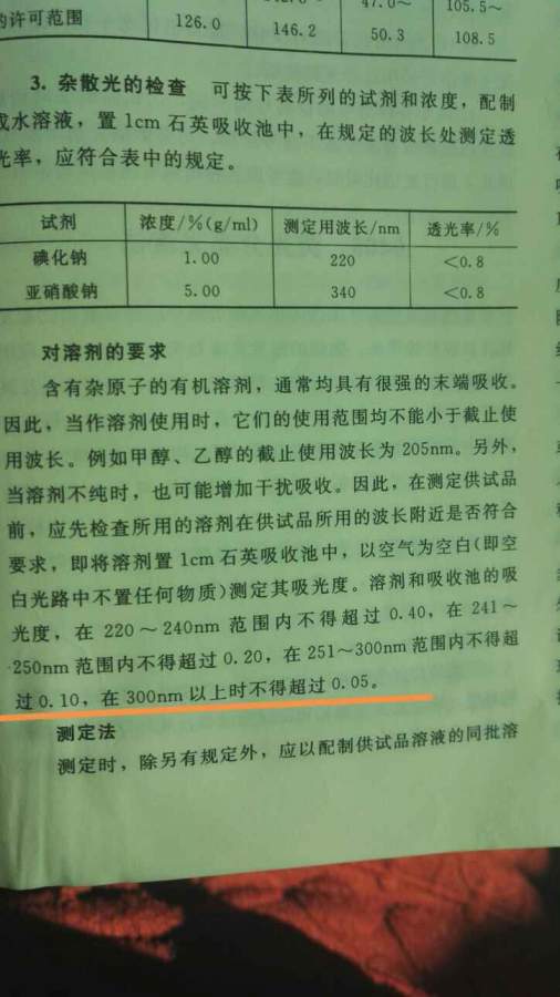 药典上规定的溶剂在300nm以上的吸光度不超过0.05,我用的是40%丙二醇做溶剂300nm以下都符合要求,但是在365nm左右的吸光度超过了0.05,请问这个要求依据是什么?会对我的药品检测有什么影响 发自小木虫Android客户端 |