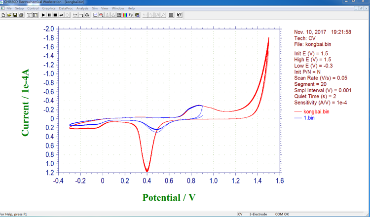 我的工作电极是金电极,对电极是铂片电极,参比电极是饱和甘汞电极,准备测定水合肼在ph为7时的缓冲液的循环伏安曲线,可是我在不添加水合肼的时候,即在空白溶液中测定就有氧化还原峰,并且最高电势不同时,测出的图也不一样!图一为空白溶液的cv,图二为加入水合肼的cv。求大神指点为什么空白溶液也会有氧化还原峰,另外为什么最高电势不同时,cv图不同 发自小木虫IOS客户端 |