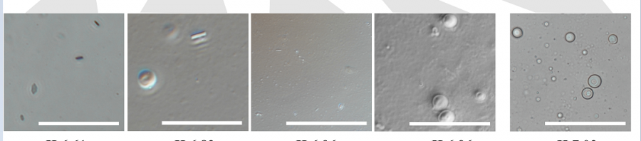 如下图是我的两亲分子(癸酸和癸酸甘油酯)的显微图像,从左往右:左一(40mM浓度样品1)左二(40mM浓度样品2) 我现在想证明左一里面全是固体没有囊泡该怎么办???我只能在显微镜里面看见全是固体并且拍了显微照片,但感觉只是显微照片不够充分。之前有看到文献里面用浑浊度来辅助证明生成囊泡的,于是我也测了液体紫外,但这两个样品在350nm(参考文献中的波长选择)处均有吸收值,感觉浑浊度无法说明里面没有囊泡。。。求大神帮忙!!!!