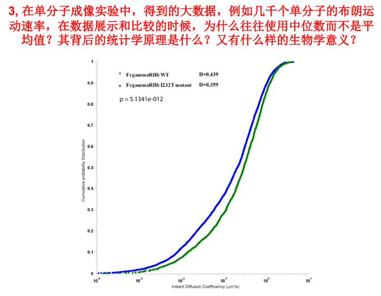 1.在信号转导过程中,观测群体细胞中的第二信使的浓度,呈现先上升再下降的一过性平滑曲线;而观测单细胞中的第二信使浓度,则出现震荡现象;如何从个体观察和群体观察角度做出解释? 2. 在问题1中,Ca++振荡频率越高,往往伴随着显著升高的CaM Kinase II的酶活性,如何解释两者的相关性? 3.在单分子成像实验中,得到的大数据,例如几千个单分子的布朗运动速率,在数据展示和比较的时候,为什么往往使用中位数而不是平均值?其背后的统计学原理是什么?又有什么样的生物学意义? 发自小木虫IOS客户端 |