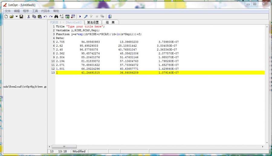 有4组数据,第一组是因变量,后三组自变量,有公式,y=a*exp((b*RINE+c*RCAP)/(d+ln(e*Nepi)))+f,求参数值 2.705 94.88560983 13.39680233 3.739800E-07 2.62 95.69529003 25.10801442 3.004050E-07 2.48 96.87788078 40.76881047 2.363340E-07 2.362 95.65742274 48.35621006 2.077570E-07 2.304 85.20401076 51.47631146 1.955370E-07 2.194 81.81839372 57.10604763 1.798260E-07 2.071 78.68601622 57.73364072 1.652780E-07 1.801 66.29224296 60.63657771 1.429860E-07 1 41.24691515 36.86086209 1.079140E-07 发自小木虫Android客户端 |