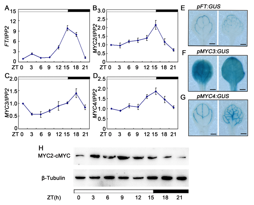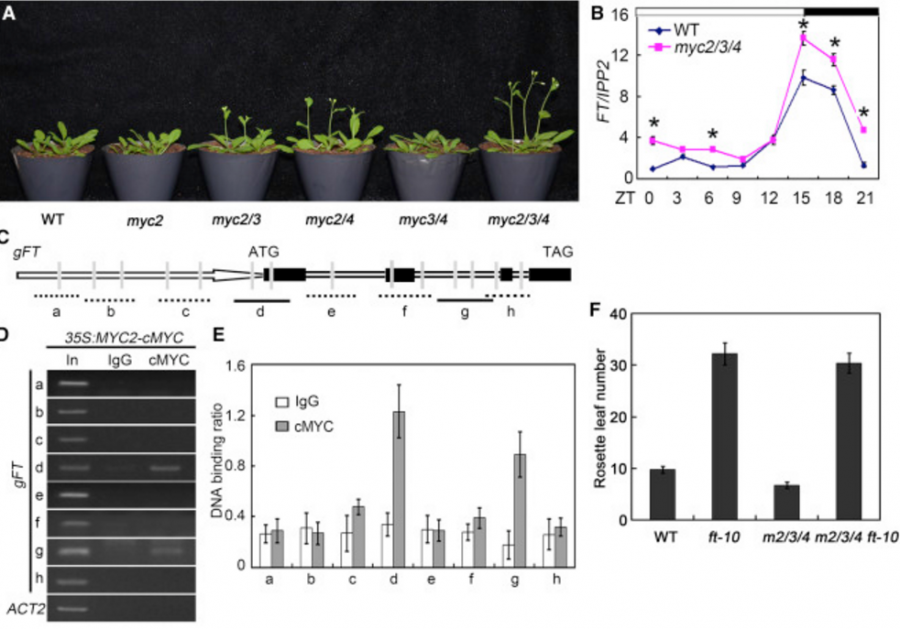 生殖是生物体生命周期中最重要的阶段之一。在被子植物中,开花使得植物从营养生长阶段顺利过渡到生殖生长阶段,从而保证植物种子的产生。而植物开花的过程受到了内外源因素,各种信号网络及众多基因的综合调控。目前研究表明,除了传统的开花诱导途径之外,植物激素茉莉酸信号途径也参与了开花诱导过程;然而,茉莉酸调控植物开花的分子机理仍不清楚。 茉莉酸(JA)是一类重要的植物激素,可调控植物的生长发育和防御反应的多个方面。虽然之前的研究表明,JA受体COI1和JA-ZIM结构域(JAZ)蛋白参与成花转变的调控(Zhai等,2015),但其中的分子机制仍不甚清楚。JA激活的转录因子MYC2、MYC3和MYC4(MYC2/3/4)是JA信号途径中研究最为广泛的。因此,研究人员首先研究了MYC2/3/4在成花转变中的作用。为研究MYC2/3/4在成花转变中的调控作用,研究人员分析了myc2突变体,myc2/3、myc2/4、myc3/4双突变体以及myc2/3/4三突变体的开花表型。在LD或SD条件下,与野生型相比,myc2/3和myc2/4双突变体表现出早开花表型。相比之下,myc2、myc3、myc4突变体和myc3/4双突变体的开花时间与野生型植株的开花时间相当。此外,在LD和SD条件下,与myc2/3和myc2/4双突变体相比,myc2/3/4三突变体表现出早开花表型。总结而言,在LD和SD条件下,三种MYC转录因子冗余地调节植物成花转变。 近日,版纳植物园植物分子生物学研究组和植物环境适应性研究组联合研究发现,茉莉酸激活的转录调控因子MYC2, MYC3和MYC4(MYC2/3/4)协同调控了拟南芥的开花诱导。表型分析表明,myc2/3/4三突变植物的开花时间明显比野生型提前。基因表达分析证实,在myc2/3/4突变体背景下,成花素基因FT的表达水平显著提高;同时,MYC2/3/4与FT展现出了相似的时空表达模式。染色质免疫沉淀实验结果表明,MYC2能够直接的结合到FT基因的染色体区域并抑制其转录。此外,外源施加茉莉酸能够有效的抑制植物开花及FT基因的转录,但这一过程部分依赖于MYC2/3/4基因。综上所述,本研究证实,在模式植物拟南芥中,茉莉酸通过其激活的转录因子MYC2/3/4来抑制FT基因的转录进而抑制植物开花诱导。 |