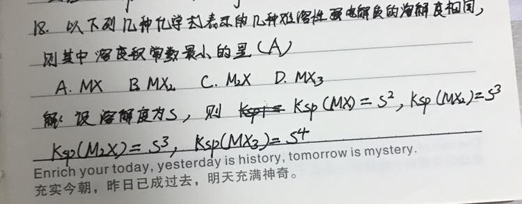MX:Ksp=S*S,MX2:ksp=S*(2S)∧2,M2X:Ksp=(2S)∧2*S,MX3:Ksp=S*(3S)∧3。难溶强电解质溶解度较小,Ksp大小:MX3<MX2=M2X<MX 发自小木虫Android客户端 |