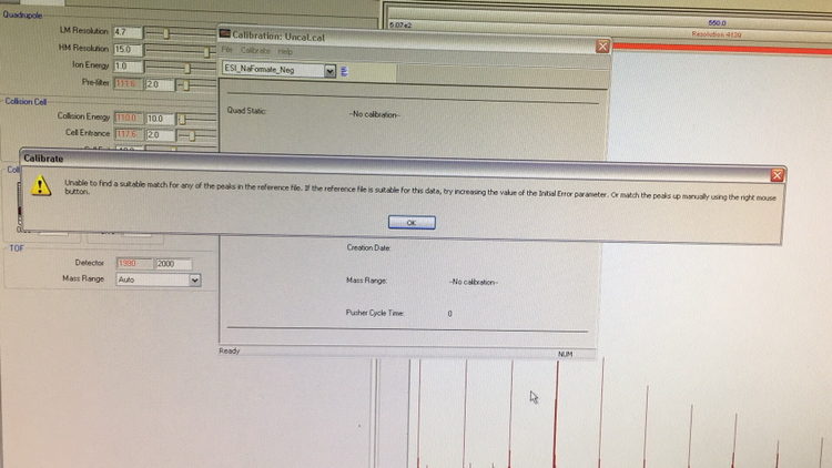 Waters UPLC q-tof primer在校准时出现这个问题,请问是什么原因?
