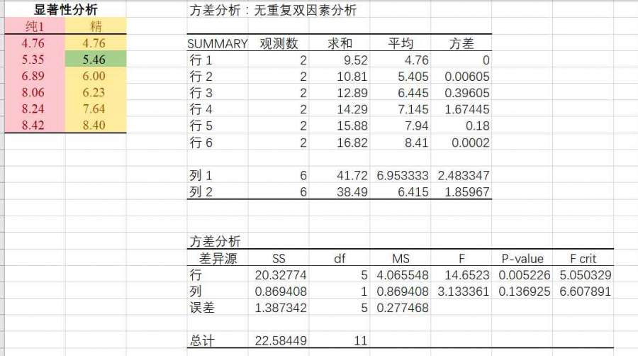 excel中利用无重复双因素分析显著性