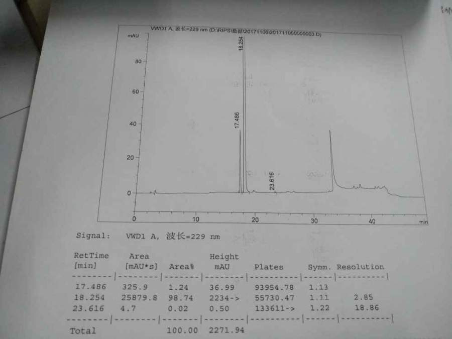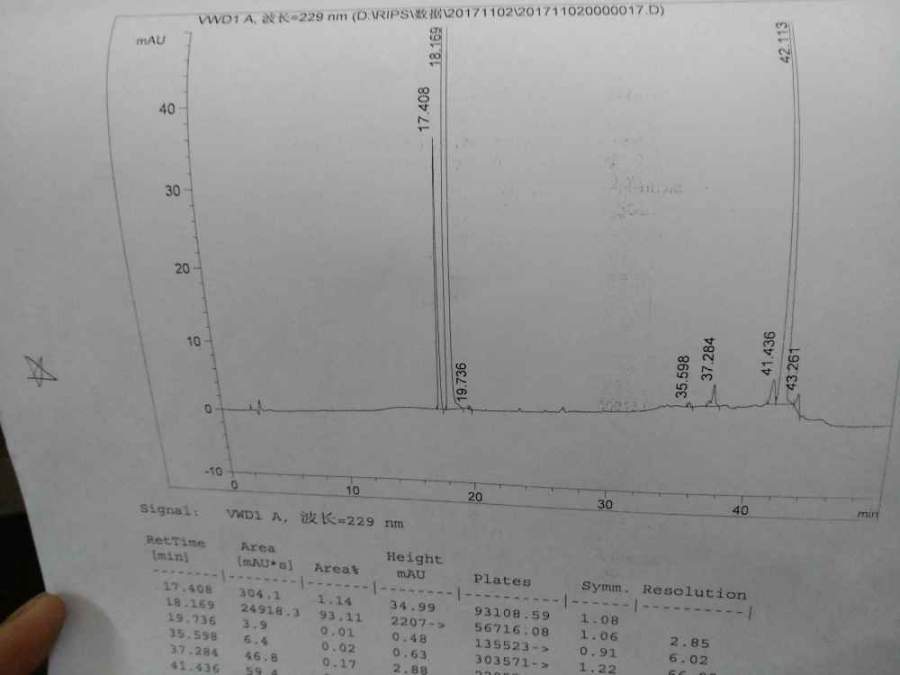 同一个样品测了两次都是安捷伦仪器229nm,第一次的42.11min 峰面积5.20%我就觉得有问题,然后过几天同一样品复测,这个鼓包就没有了。我液相用的不多,希望高人说一下啥原因导致的呢??以后怎么避免呢?(图2后面未积分的是空白) @学术巨星 发自小木虫Android客户端 |