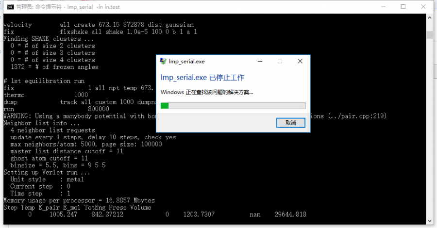 如题,程序运行时,出现press为nan的情况,其他参数较为正常,程序意外终止,现在我确定我的data文件没有问题,那么还有那些问题可能导致压力出现无穷大?我看了官网lammps计算press的公式,感觉它的分母也很难为0啊 K~9EKQD64(1BRXFQDG1]8IV.png 1A`J2P16C{9D~YCQMG7670V.png |