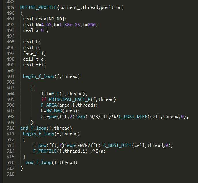 我想定义壁面电流边界条件,电流密度是与边界相邻的单元温度、电导率有关的函数,请问如何在DEFINE_PROFILE里面提取相邻流体域网格的物性参数?顺便问下 我可以在DEFINE_PROFILE里面用两次begin_f_loop(f,thread) 循环吗 1.jpg 当前程序,编译会报错说C_UDSI_DIFF(cell,thread,0);是未定义变量 2.png |