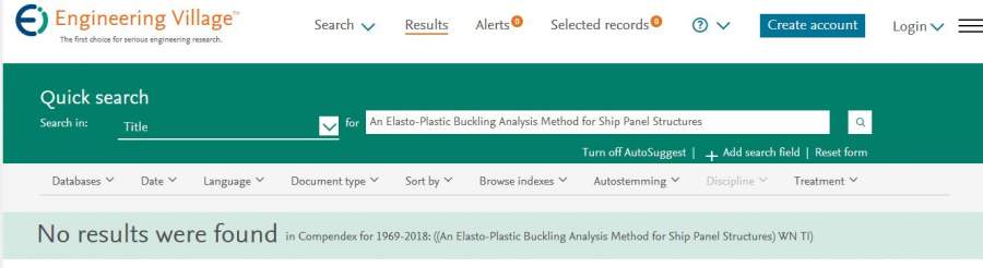求助以下文献的EI收录情况,查询结果打印成pdf,在学校的大神赞助下,不胜感激,没收录的话也请截个图,非常感谢。 1.题名:An Elasto-Plastic Buckling Analysis Method for Ship Panel Structures, 作者: Lu Yining, Qi Enrong, 期刊:2015 World Maritime Technology Conference, Providence, Rhode Island, USA, 2015. 2. 题名:Wave-induced responses of a bulk carrier in heading and following seas, 作者:X.L. Wang, R.M. Liu, J.J. Hu, 期刊:Analysis and Design of Marine Structures(MARSTRUCT), Southampton, UK, 2015. |