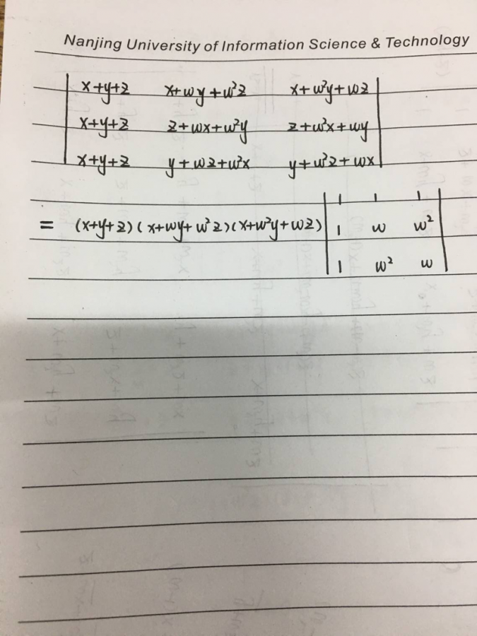 观察可以看出来,括号里的都是原行列式的第一行,所以你要证明成立,就证明后面两列的元素分别乘上括号里的元素满足最后一行的形式。可以发现ω^3=1 发自小木虫Android客户端 |