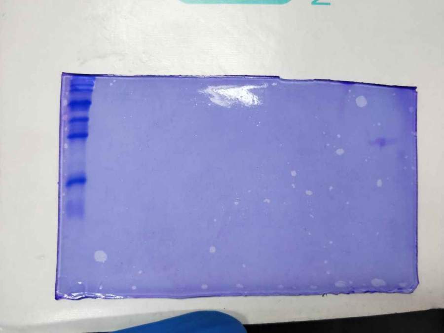 推测 1考马斯亮蓝时间太久了 染色效果不好 建议重新配制 2蛋白含量太低 或者上面实验有问题没有蛋白 建议增加正对照 就是肯定能跑出来的蛋白 排除配胶 染色等问题 3蛋白含量太低脱色时间不够 联系二脱 再脱色干净一点 看看 发自小木虫Android客户端 |