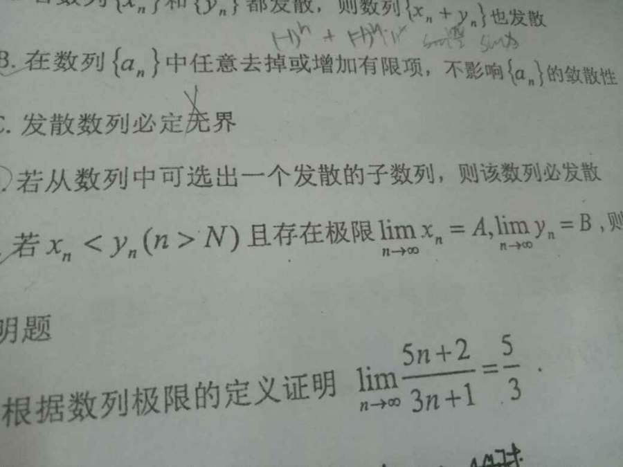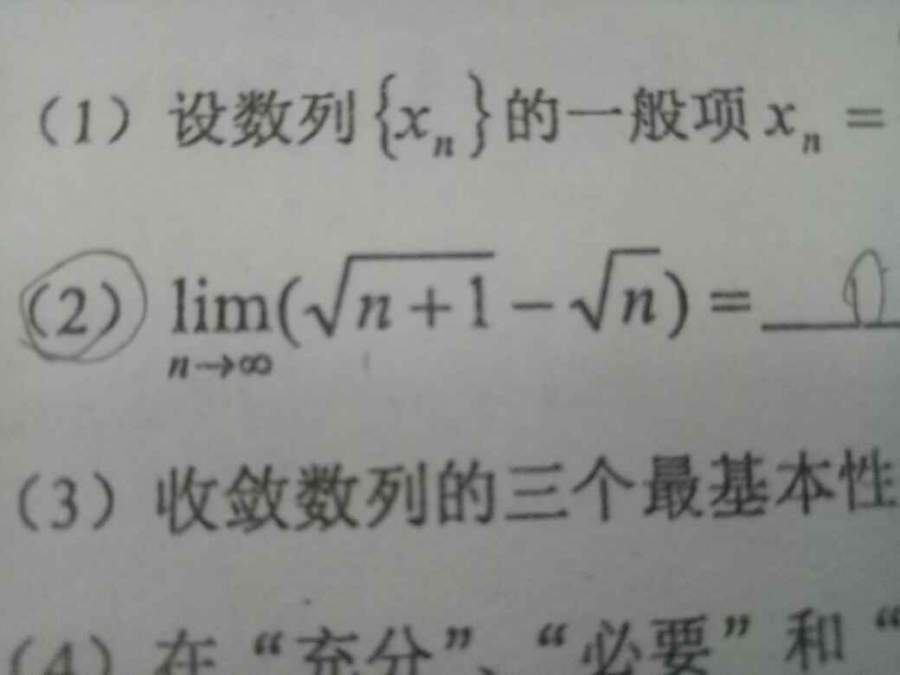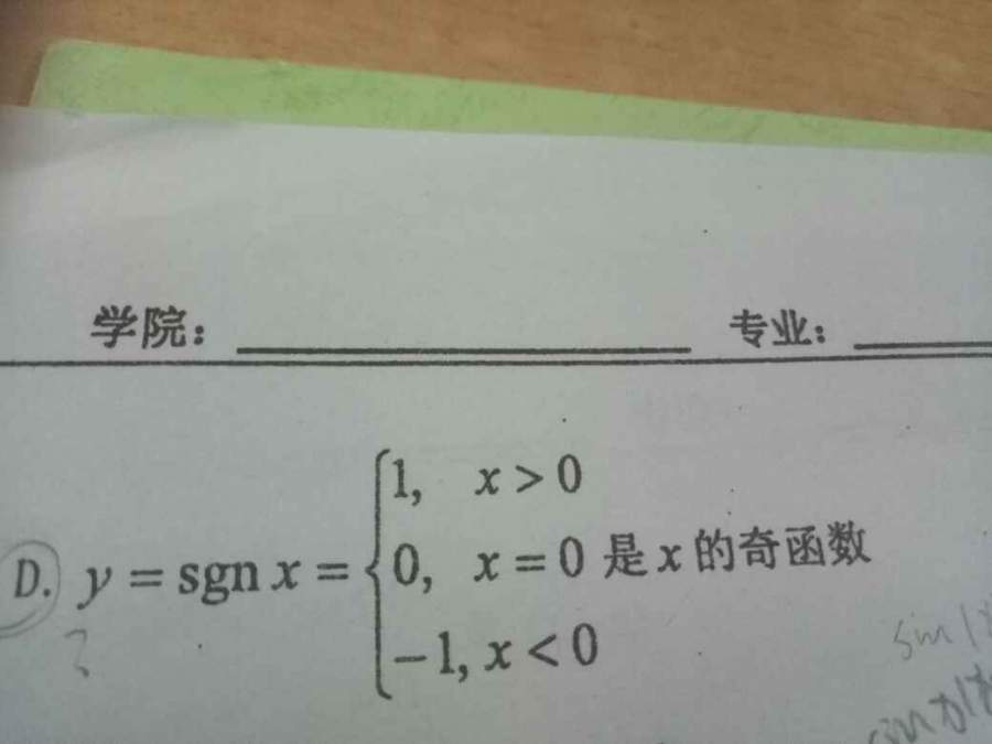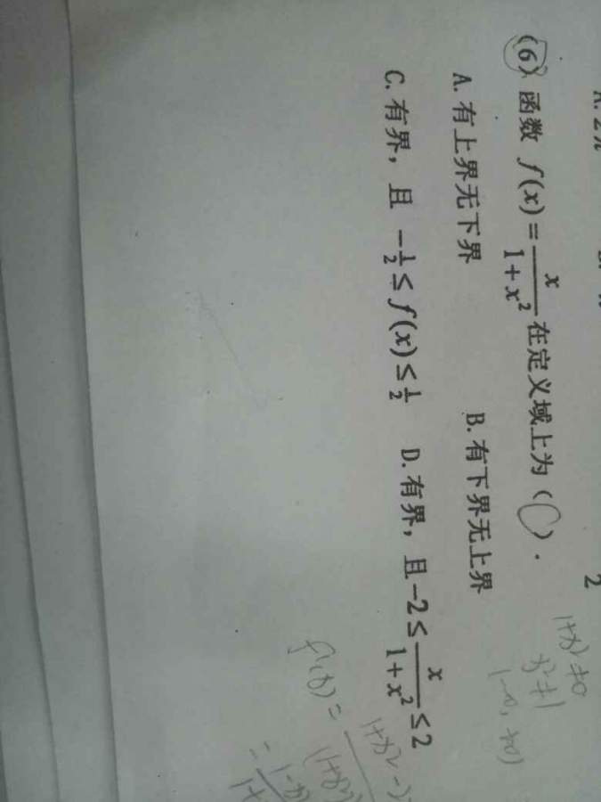 (1)只要证明Sign(-x)=-Sign(x)即可。实际上,x>0时,Sign(-x)=-1;x=0时,Sign(-x)=0;x<0时,Sign(-x)=1 。由此可知,在x∈(-∞,∞),Sign(-x)=-Sign(x)总是成立的,因此,结论得证。 (2)f(x)=x/(1+x^2) ,在实数范围里,x的定义域为(-∞,∞)。f'(x)=(1-x^2)/(1+x^2)^2,驻点为x=±1 ; f''(x)=2*x*[(x^2-1)^2-7]/(1+x^2)^4 x=-1时,f''(x)=(-2)*(-7)/16=7/8>0,此处有极小值,为f(-1)=-1/2 ; x= 1时,f''(x)=(2)*(-7)/16=-7/8<0 ,此处有极大值,为f(1)=-1/2 而当x趋于正负无穷时,f(X)都趋于零,因此在整个实数范围里,f(x)∈(-1/2,1/2), 故选C。 (3)sqrt(n+1)-sqrt(n)=1/[sqrt(n+1)+sqrt(n)] ,因此,当n趋于无穷时,极限趋于零。 |
