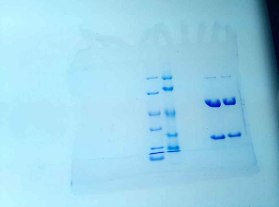 可能是蛋白降解后的碎片,由于凝胶分辨率不够的原因,在电泳过程中移动速率一致。还有marker最小分子量的条带跑出来你是怎么确定的?也有可能是因为分离胶的分辨率不够,导致marker最下面的两个条带没有分开,跑成一条带了 发自小木虫Android客户端 |