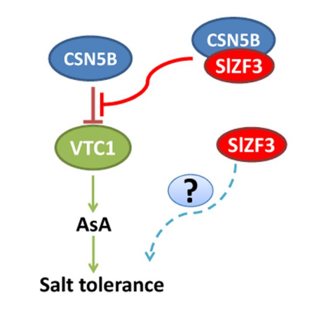 该研究解析了番茄SlZF3锌指蛋白通过与COP9信号复合体(CSN)的亚基CSN5B蛋白互作,从而调控植物抗坏血酸含量以及耐盐性的机制。 盐、干旱等非生物学逆境是造成作物减产的主要因素之一。当植物生长遭受逆境胁迫时,体内会产生大量的活性氧(ROS),而ROS过度积累会对植物生长造成严重破坏。利用抗坏血酸来清除活性氧ROS是植物适应逆境胁迫的重要手段之一。目前,植物中鉴定了4条抗坏血酸合成途径,其中D-甘露醇/L-半乳糖 (D-Man/L-Gal)途径发挥主要作用,其中VTC1(甘露糖焦磷酸化酶)是该合成途径的一个重要酶。尽管抗坏血酸的合成和代谢途径研究比较深入,但是该途径的调控因子还有待发掘,目前只发现了少数的调控因子。 在课题组的前期研究中,通过植物芯片技术鉴定了一批盐胁迫快速响应的转录因子,其中包括一个C2H2型锌指蛋白SlZF3。番茄中虽然有超过100个基因编码锌指蛋白,但是功能得到鉴定的基因非常少。在该研究发现SlZF3的转录受盐胁迫快速诱导,在番茄和拟南芥中超表达该基因均能显著地提高耐盐性。进一步研究发现,SlZF3可以与COP9信号复合体(CSN)的亚基CSN5B蛋白互作,但是该互作如何影响植物的耐盐性的机理还不清楚。 该课题组通过双荧光分子互补(BIFC)、荧光素酶报告系统分析、蛋白质免疫共沉淀(Co-IP)以及蛋白质杂交(Western blot)等多方面的实验发现SlZF3可通过干扰CSN5B与VTC1互作,从而阻止CSN5B对VTC1的降解,VTC1的积累导致抗坏血酸的合成增强。抗坏血酸积累使得植株清除ROS的能力增强,植株抗逆性得到提高。本研究鉴定了一个新的转录因子SlZF3,参与调控抗坏血酸的合成并调节植物的耐盐性。 |