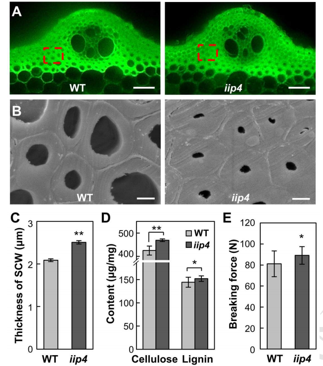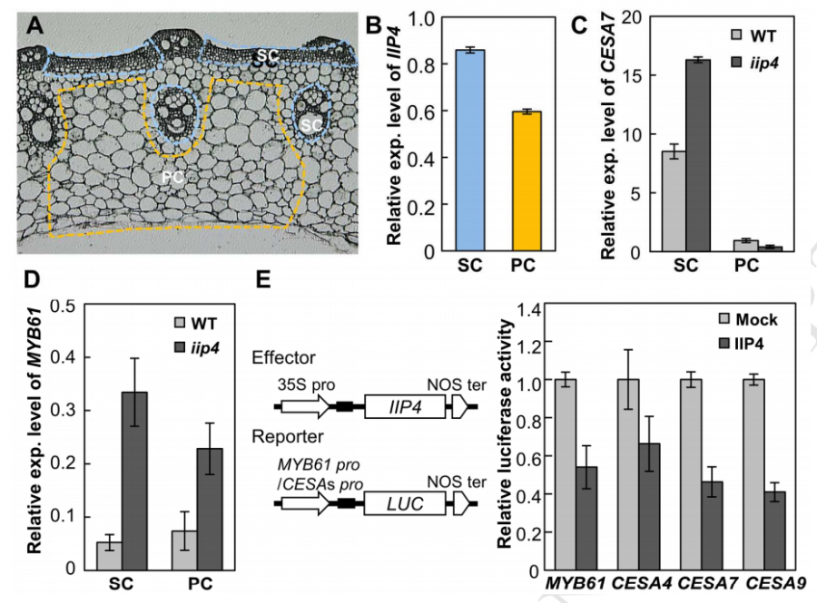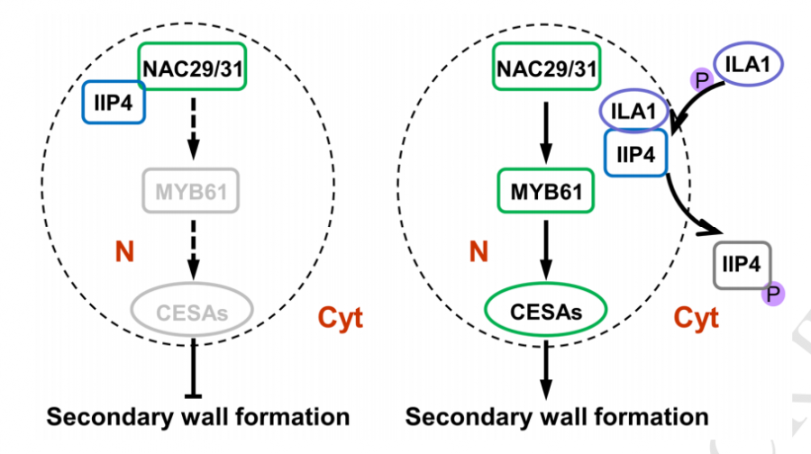 次生壁是地球上最丰富的可再生资源,天然次生壁常被生产成多种纤维制品,服务人们的日常生活,也可以作为造纸业和生物能源的原料,具有重要的经济价值。次生壁是植物生长的物质基础,影响生命活动的众多生理过程。例如,水稻中次生壁合成水平与质量直接关系到株高、抗倒伏性等重要的农艺性状,因而其合成受到严格调控。研究发现,大量NAC、MYB等类型的转录因子构成复杂的网络,以应答植物体内外各种信号、精准调控次生壁生物合成。然而,迄今为止鉴定到的负调控因子极少。Increase leaf angle1 (ILA1) 是前期报道的调控次生壁形成的Raf-like MAPKKK蛋白,互作蛋白ILA1 interacting protein4 (IIP4) 是其磷酸化底物,生物学功能未知。 纤维素是植物细胞壁中最主要的成分。它是由位于质膜上的纤维素合酶复合体(Cellulose Synthase Complexes,CSCs)合成。纤维素合酶催化亚基(Cellulose Synthase,CESA)是目前唯一已鉴定出的CSC复合体成员。研究表明,除CESA外,还有其它许多蛋白也参与了纤维素的合成,但具体的机制仍不清楚。 中国科学院遗传与发育生物学研究所周奕华研究组利用CRISPR/Cas9基因编辑技术创制iip4突变体,发现其突变体次生壁厚度明显增加,纤维素和木质素含量略有上升,表明IIP4负调控水稻次生壁的合成。生化和分子生物学研究发现,IIP4与次生壁合成的顶层关键调控因子NAC29/NAC31互作,抑制其下游所调控基因、如MYB61、CESA4、CESA7、CESA9的表达,从而干扰次生壁合成。被ILA1磷酸化的IIP4亚细胞定位发生改变,由核中转移到细胞质,导致细胞核中的互作蛋白NAC29/NAC31被释放,促进下游基因的表达和次生壁合成。对IIP4的序列分析发现,它具有规律重复的非典型CCCH基序(C-X4-C-X10-C-X2-H)。IIP4同源蛋白在植物中广泛存在且高度保守,暗示其功能的重要性。IIP4对次生壁合成的调控作用可以用于改良作物抗倒伏性。该研究解析了ILA1-IIP的信号转导通路,为阐明水稻次生壁形成的分子机制以及作物高产优质分子设计育种提供了重要依据。 |