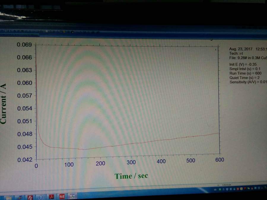 一直在用CHI660E 的i-t curve做电沉积铜膜,但是最近的i-t图扫出来很不正常,电流比以前小了两个数量级而且沉积不到铜,电位设置跟原来一样。(排除了参比电极,工作电极的问题)请高手帮忙看一下是什么问题。(第一个图正常,第二个图有问题) 发自小木虫Android客户端 [ Last edited by 凌乱奥利奥 on 2017-12-6 at 20:41 ] |