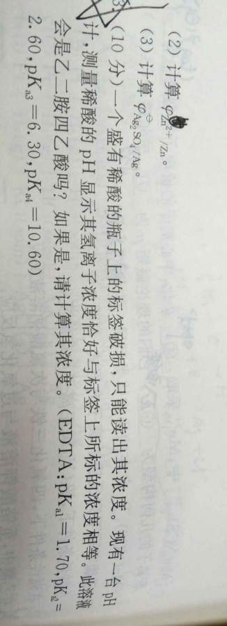 假定是EDTA = H4Y,由其离解常数可知,Ka1和Ka2相近,不能忽略第二级解离,可以忽略第三和第四级解离; 设第一解离的H+浓度为x,第二级为y,再考虑测定出的H+浓度等于溶液的浓度(x+y),则有如下关系: H4Y = H+ + H3Y- c-x = y x+y x-y H3Y- = H+ + H2Y2- x-y x+y y 根据第一二两级的解离常数: (x+y)(x-y)/y = Ka1 (x+y)y /(x-y) = Ka2 (x-y)^2/y^2 = Ka1/Ka2 (x-y) = y(Ka1/Ka2)^(1/2) 求出x, y后,余下就简单了。 |