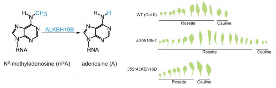 DNA修饰如甲基化作为表观遗传标记影响基因表达和功能。在RNA上类似的修饰目前正越来越受到重视,所以出现了表观转录组分析。RNA修饰在真核生物中普遍存在,在哺乳动物中的研究最为透彻,目前已知逆转mRNA甲基化参与细胞命运转变到胁迫响应等一系列的生物进程(Zhao et al., 2017)。mRNA及其它RNA的甲基化在植物中同样存在。最近的表观转录组研究显示在拟南芥的转录组中有超过1000个胞嘧啶甲基化位点。在哺乳动物中,N6-甲基腺苷m6A是最常见的mRNA修饰。m6A标记是可逆的,它可以通过一些亚基组合形成的甲基化复合物“写”到mRNA上,同时可以通过去甲基化作用“擦除”mRNA上的m6A。一个叫做“readers”会读取这些标记,并通过改变RNA的剪切、成熟、翻译和降解将这些标记信息传递到下游效应。 最近报道了第一个植物中m6A擦除同源基因,即拟南芥的ALKBH9B,同源于人类中的m6A去甲基化ALKBH5,其具有m6A去甲基化活性,并参与到病毒感染的防御(Martínez-Pérez et al., 2017)。现在,Duan et al.(2017)报道了另外一个m6A去甲基化酶,其参与到开花时间的调控。在拟南芥中和人类ALKBH5同源的五个基因中,Duan和其同事发现ALKBH10B在花中具有最大丰度的转录本,并且在测试的大多组织中均有表达。ALKBH10B在本氏烟中表达,纯化的蛋白显示m6A去甲基化活性依赖于两个保守的离子(II)结合残基。与人ALKBH5相似,相对于茎环结构底物RNA,ALKBH10B与非结构RNA(或是单链RNA)底物在离体实验中具有更强的活性。 作者发现alkbh10b-1突变体在生殖器官和营养器官中均具有更高水平的m6A修饰的mRNA,在野生型植株中过表达ALKBH10B会降低m6A水平,表明ALKBH10B确实在体内起到RNA去甲基化酶的作用。作者进一步显示了这种活性是针对mRNA的m6A特异存在的。值得注意的是,alkbh10b-1突变体存在晚花的现象,而过表达株系则存在提前开花。作者发现ALKBH10B的活性增强了促进开花基因FT的转录本积累,相比于野生型,FT的mRNA在突变体中有着更高水平的m6A。FT调控子SPL3和SPL9同样在alkbh10b-1突变体中具有更低的转录水平和更高的m6A水平。此外,Duan et al.显示ALKBH10B会直接与FT,SPL3和SPL9基因的转录本互作。去甲基化降低了这些转录本的降解,与其在人类mRNA上的作用类似。最终,Duan et al.揭示了整个ALKBH10B介导的去甲基化作用,并鉴定了1190基因上1276个位点相比于野生型在突变体中具有更高水平的m6A。他们的工作为理解m6A类型的甲基化及去甲基化在植物中的作用奠定了基础,显示其具有与哺乳动物类似的基础特性。另外,显然开花时间的调控应该包括通过对多个转录本进行m6A修饰的转录后调控。 |