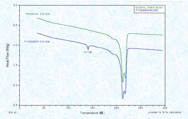 如图,这是测试机构对PA6加纤测试的熔融曲线,绿色是之前送样的曲线,蓝色是现在送样的曲线。目前两者材料的配方一样,但机构测试出来在141℃附近就是多了一个吸热峰(重复测试,峰值第一次是137℃,第二次是141℃),请问下这是什么原因呢?把同一批次的样拿到本地仪器测试,也没有发现。 PA6+GF熔融曲线.jpg |