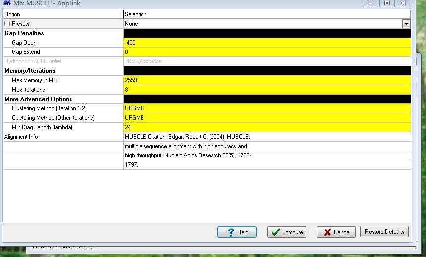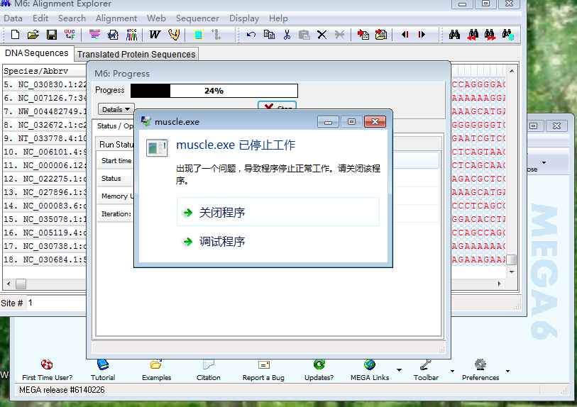 MEGA6 构建进化树出现muscle.exe已停止工作,导致无法继续往后走,得不到结果 已有3人参与