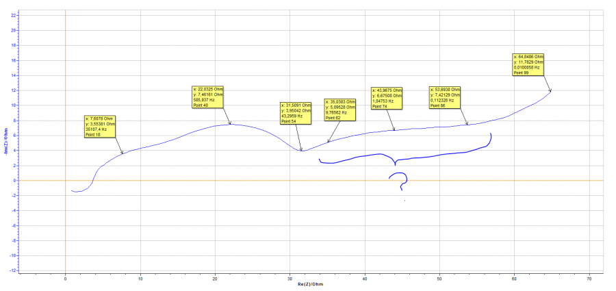 造的Si/C 和 Li 的半电池, 测的电化学阻抗谱如下图所示, 后面一段不知道对应什么电化学过程,Warburg 应该从哪开始呢? 一些点的频率我已经标出来了,一般来说warburg 应该是从10 Hz 开始么? Unbenannt.PNG |