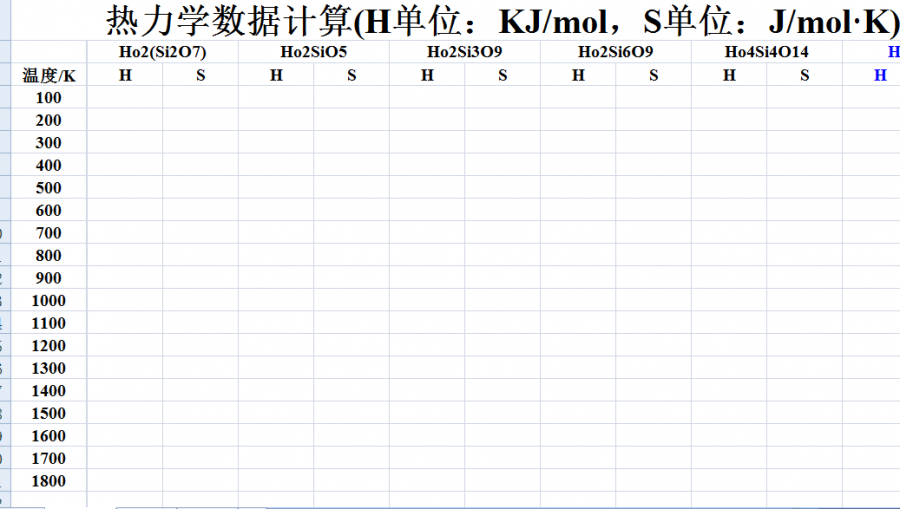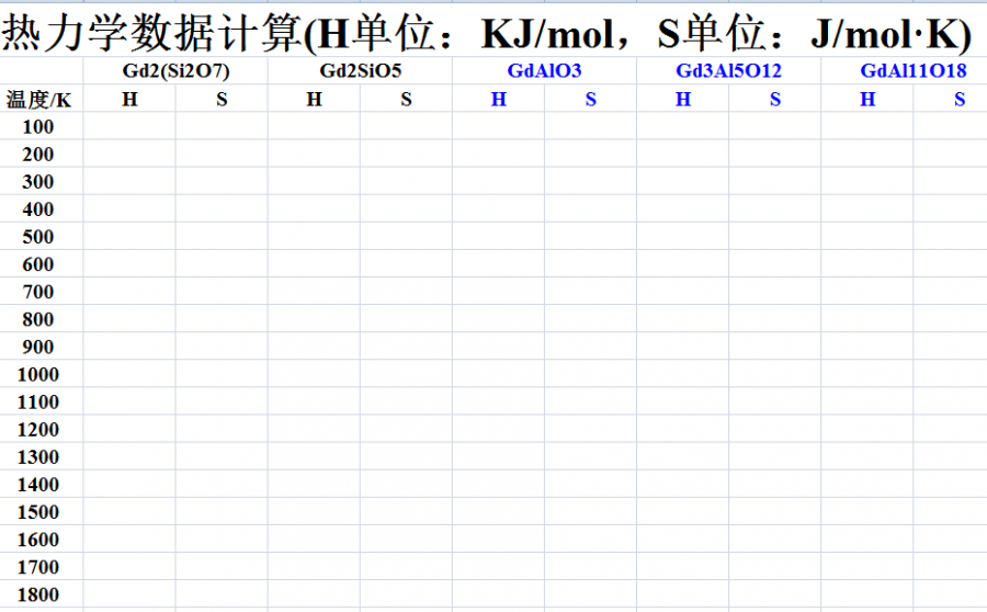 请教各位同学老师,求助硅酸钬(各种) 与硅酸钆(各种)的H与S,或者告诉Cp也行,最终我要得到Gd2Si2O7、Gd2SiO5与Ho2Si2O7、Ho2SiO5、Ho2Si3O9、Ho2Si6O9、Ho4Si4O14的在0~1700℃的H与S。谢谢各位,具体如图片所示。 @chinaworm 硅酸钬热力学数据查询.png 硅酸钆热力学数据查询.png |