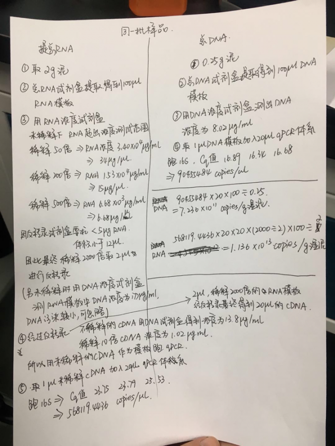 问题太长,标题打不下 完整提问:通过总RNA反转录cDNA和总DNA跑qPCR的16S能否通过最终拷贝数的差异确定RNA在活菌的体现上优于DNA 问题有些长,新人币不多,全部贡献出来,求交流!!! 首先有个背景,因为RNA 的半衰期较短,通常只有几分钟到十几分钟,如果细胞膜或细胞壁破裂,RNA很快就会降解,所以希望能够通过RNA和DNA提取的差异,剔除样品中死菌 基于这样的设想,想要做方法的验证,之前有相关文献进行了这样的操作,的确是有一定的可行性,但是对于提出来的模版,他进行了高通量测序,但因为RNA比较难提,高通量成本也高,所以在每一个在做高通量之前都能有个其他的表征来验证我的操作是否成功 所以我做了以下实验,具体实验数据和方法我写在了下一张图上,如果只是根据我的稀释倍数等换算,RNA的浓度要大于DNA近25倍,后来查了资料也可能在反转录的时候要考虑到反转录后会有倍数增加,但也不会使RNA小于DNA…… 所以是否有前人告诉我计算上哪里的明显失误,或是这个方法可不可行呢 大家的一点意见都万分感谢 发自小木虫IOS客户端 |