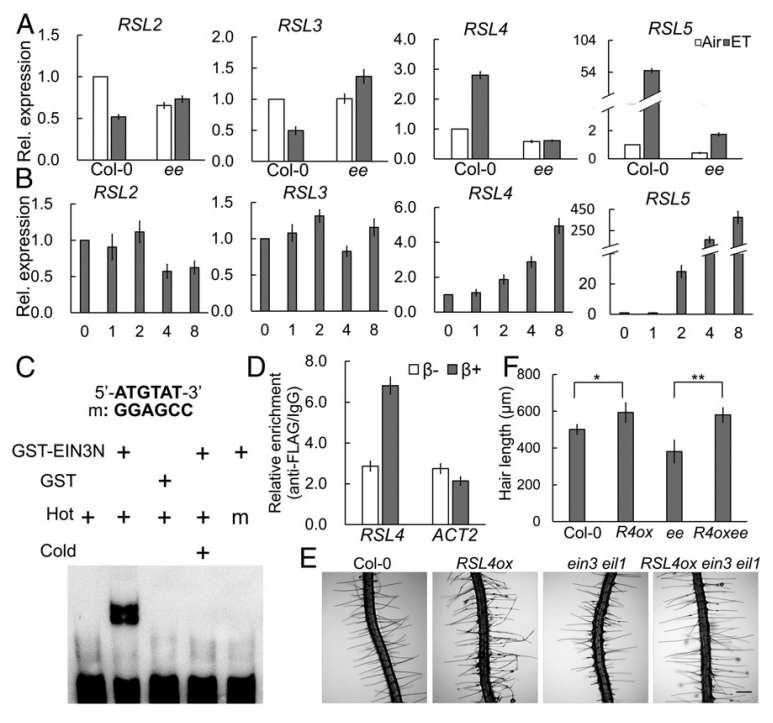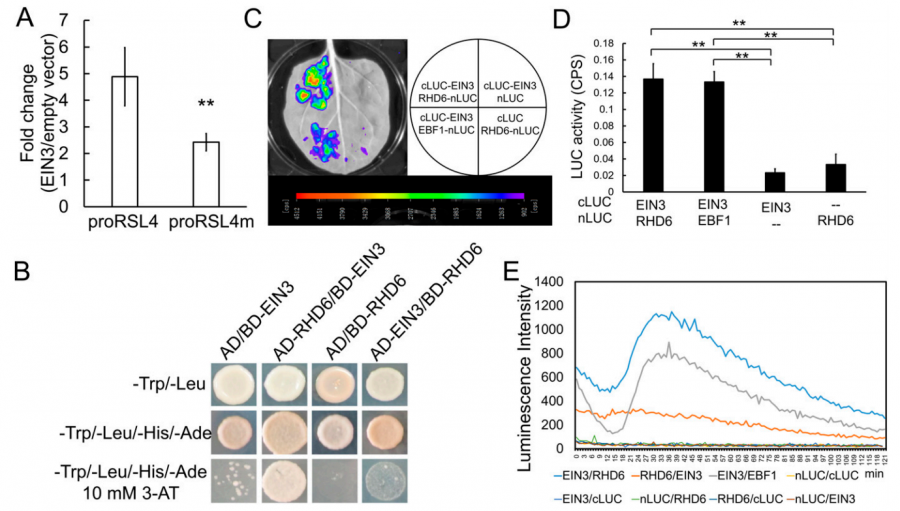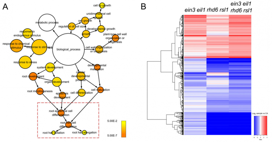 根毛是植物吸收水分、矿质元素以及与土壤微生物进行相互作用的重要器官。乙烯是一种重要的植物激素,对根毛生长发育具有调控作用,但其作用机制尚未完全了解。南方科技大学揭示了乙烯调控拟南芥根毛生长发育的分子机制,研究结果为通过分子育种提高植物营养吸收能力等优良性状提供了理论依据。 根毛是植物根表皮的管状突起,是植物吸收水分、矿质元素以及与土壤微生物进行相互作用的重要器官。根毛的生长发育具有高度的可塑性,其生长密度与相对长度都可应对土壤环境的不同作出适应性的调节,是研究植物环境响应的良好模型。乙烯是植物重要的环境胁迫信号分子,对根毛生长发育的调控作用很早就被发现,但对于其中的作用机制却一直不清楚。 植物乙烯信号转导领域处于国际领先地位,多年来为乙烯信号转导分子机制的阐明做出了重要的贡献,其中包括发现乙烯信号转导的蛋白降解模型(Cell, 2003; Plant Cell, 2010)、乙烯信号从内质网到细胞核传递的“剪切-入核”机制(Cell Research, 2012)及3’UTR非编码RNA介导的翻译调控模型(PNAS, 2006;Cell, 2015)等一系列突破性成果。此外,多年来团队也一直关注乙烯信号调控植物根生长(Plant Cell, 2011)、顶端弯构形成(Cell Research 2012; Plant Cell, 2014)及衰老(Plant Cell, 2013; 2017)等生长发育过程的分子遗传机制。郭红卫团队PNAS发表的这一最新成果主要揭示了植物激素乙烯调控拟南芥根毛生长发育的分子机制,该研究加深了对乙烯生理功能机制的理解,为通过分子育种提高植物营养吸收能力等优良性状提供了理论依据。 研究团队首先通过分子遗传分析发现,乙烯信号通过核心转录因子EIN3/EIL1直接调控根毛生长的主效调控因子RSL4基因的转录表达,从而促进拟南芥根毛的伸长(elongation)生长。进一步研究发现,乙烯对根毛伸长的促进作用很大程度上依赖于根毛发生重要调控因子RHD6/RSL1的功能。通过体内外相互作用和亚细胞共定位等分析,团队揭示了EIN3/EIL1与RHD6/RSL1协同调控RSL4基因转录表达从而促进根毛伸长的分子机制。由于RHD6/RSL1是非典型的转录因子,其DNA结合能力一直没有得到证实,EIN3/EIL1与RHD6/RSL1的协同互作机制阐明了RHD6/RSL1发挥转录调控功能的可能机制。 为了进一步探索EIN3/EIL1与RHD6/RSL1的协同互作在根毛发育过程中的重要作用,团队在已有分子遗传证据的基础上进行了转录组分析。研究发现EIN3/EIL1与RHD6/RSL1协同调控大量根毛生长发育相关基因,这些下游基因不仅参与根毛的伸长生长,还涉及根毛的起始发育。进一步的表型分析也很好的应证了转录组的结果:ein3 eil1 rhd6 rsl1多重突变体对外施乙烯、生长素、细胞分裂素及缺磷、缺氮等环境刺激不敏感。相对于野生型或rhd6 rsl1双突变体,ein3 eil1 rhd6 rsl1的根毛发育不能被诱导起始。这些结果表明,EIN3/EIL1与RHD6/RSL1的协同互作提供了环境信号和内源发育信号之间整合节点,在拟南芥根毛的起始发育和伸长生长中都起到至关重要的作用。 |