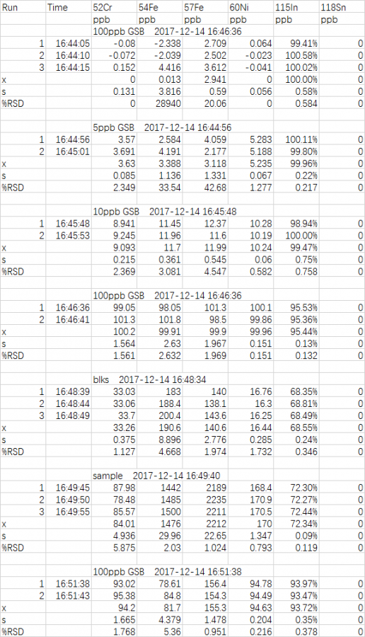 之前没接触过这个,测完之后老师发过来的数据看不懂,想分析这些元素的含量,求助我该怎么看这个数据。那个RSD就是百分比吗,还有那几个GSB意味着什么。 发自小木虫IOS客户端 |