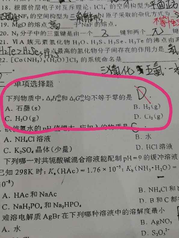 这四个选项中只有C H2O(g)不是稳定物质,所以它的标准摩尔生成焓和标准摩尔生成自由能都不为零