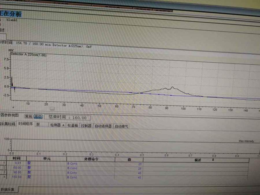 流动相A是磷酸二氢钾 流动相B是乙腈,60分钟梯度乙腈从25%到45%,压力下降梯度上漂都正常,到90.分钟后平衡阶段,基线就往下掉,请问这是怎么回事?有高手吗? 发自小木虫Android客户端 |