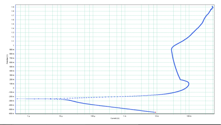 我是做硬质合金电解的,原理是需要通过电化学方法使得硬质合金中wc和Co相互分离;为了避免在电解过程中发生阳极钝化生成副产物降低电解效率,故测量了硬质合金的极化曲线(如下图),想请教一下:1.在电压为0.1mV是否是临界钝化电位;2.适当的电解电压应该是多少?或者电流密度是多少呢?(测试试样面积为1cm?) @Gamry-电化学 @langzhizhou @langzhizhou 发自小木虫IOS客户端 |