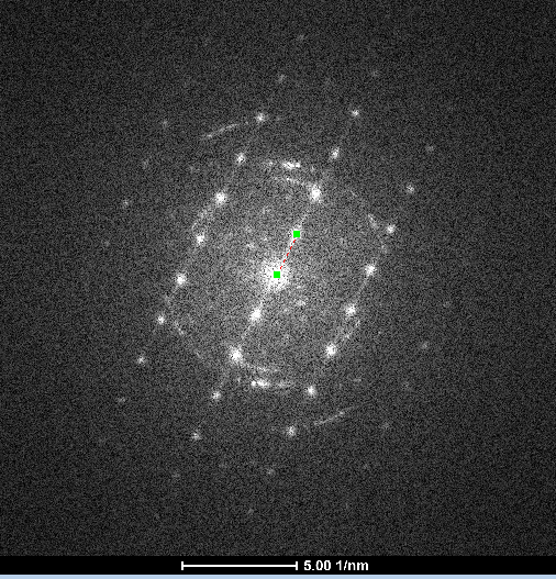 我用DM标的过程是:先用ROI虚线,选定标尺长度,然后使用calibrate中,选中1/nm,Enter d-spacing中填0.2,然后再量R长度,用1/R计算d,发现计算出来的晶面间距有0.5nm,明显不对,因为这个材料正常应该在0.3nm以内。 图上的标尺是5 1/nm 捕获.PNG@jackdeng@lich666 |