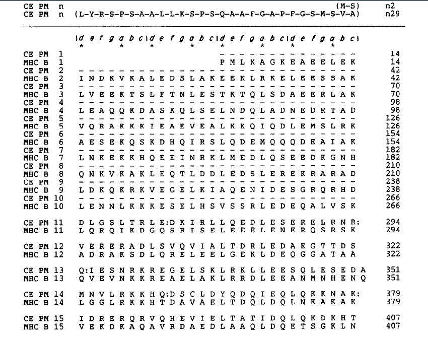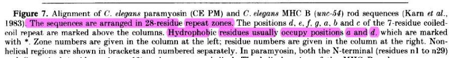 paramyosin-specific epitope showed the sevenresidue hydrophobic amino acid repeat sequence expected for an a-helical coiled-coil protein such as paramyosin ”,我想知道这个疏水氨基酸残基是怎么说是7个重复序列,那个图中的abcdegf是根据什么标注的啊!求大神给分析一下