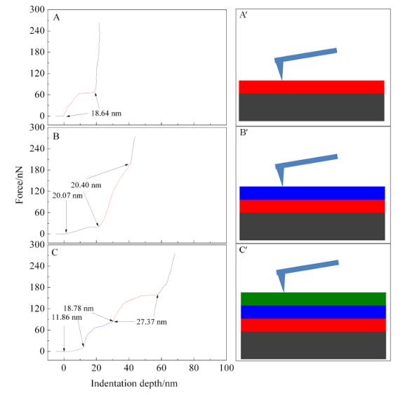 最近看到一篇论文,采用纳米压痕直接测试纳米镀层厚度,即利用纳金刚石压头压入镀层表面,由于镀层与基体硬度不同,在金刚石压头穿过镀层进入基体时,所受压力不同,从而获得的压力-压入深度曲线也应该不是一个平滑的曲线,即具有不同斜率。作者通过测试压力-压入深度曲线上的各个斜率对应的压入深度进而获得镀层厚度(可见附图)。 在这里想请问各位,这种方法是否可行? 准确度如何? 纳米压痕应力-压入深度曲线 |