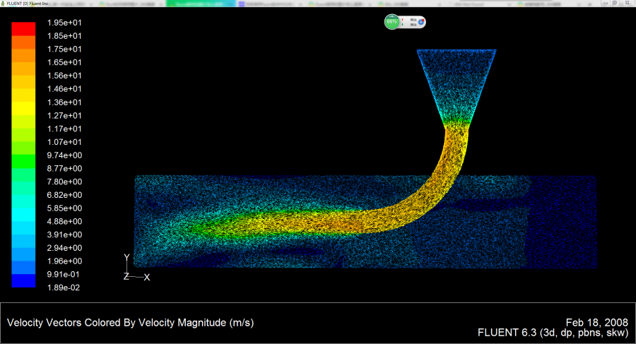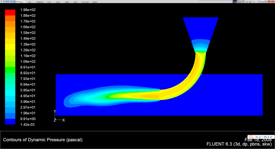 我模拟的一个局部水力装置,设置的渐缩喷管速度入口流速为1.2m/s。母管速度入口(即右侧)流速为0.6m/s。弯管处流速经计算应该是14.7m/s。在速度图上相应区域数值基本相匹配,但动压图出入太大,都不在一个数量级!请求各位大神为什么?流体为水!谢谢! 速度图.png 动压图.png |